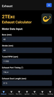 • Exhaust Calculator – Tuned length, diameters, cone angles (diffuser, reflector & header), 1- & 3-stage designs, stinger plus restrictor for the correct back pressure, controlled pressure drop, and thermodynamics. Optimize resonance tuned RPM, wave timing, torque curve, and power band.