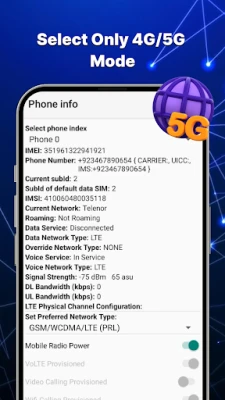 Easily connect to 3G, 4G LTE, 5G modes using this app. On App dashboard click on 4G/5G LTE button and then click on LTE Settings. Find Set Proffered Network Type and choose your preferred network from the list. You can Choose 3G, 4G LTE Only, or 5G network depending on your device supported networks.