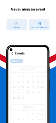 NEVER MISS AN EVENT The event section shows a list of events throughout the district. Users can add an event to their calendar to share the event with friends and family with one tap.