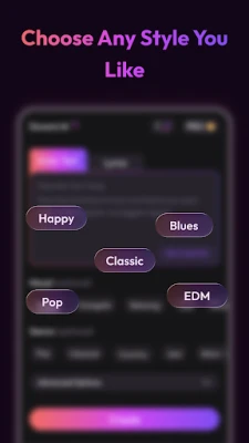 Customize your AI-generated songs with mood, genre, and vocal style options.