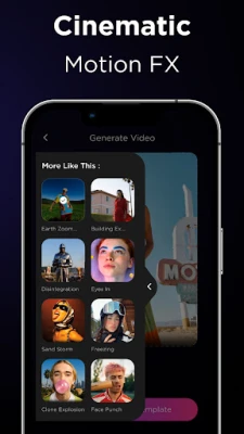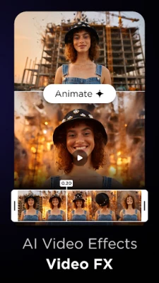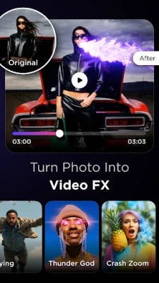 AI Video Effects - Video FX helps users create unique videos and photos using AI-powered visual effects and filters. The app provides a wide range of video templates such as clone explosion, car chasing, 3D rotation, and glam transitions. Users can apply these effects easily without advanced editing skills.
