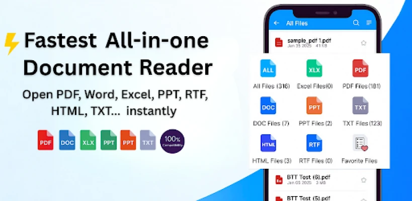 All Document Reader is a fast, lightweight, and powerful document reader app that helps you open and view all your documents in one place. Read PDF, Word, Excel, PowerPoint, TXT, RTF, and HTML files easily with a clean and simple interface.