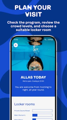 Plan your visit to Allas in advance by checking the week's events, opening times, pool temperatures, current news, congestion situation and more. With the Allas app, you can join the Allas Friends community or buy a membership, which gives you unlimited access to swimming, saunas and weekly member classes, among other things. You get access to changing benefits and offers for restaurants and Allas Shop products. You can also mark your visits, track your progress and sign up for member activities and events. From your personal profile, you can see your valid products, and you can suspend your membership for a limited period of time.