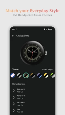 The watch face presents you with 15+ handpicked color themes to match your everyday style.