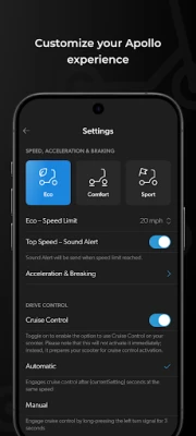 The Apollo App pairs with our new generation of smart electric scooters and allows riders to refine and customize their riding experience to their liking. Take full control of your journey with Navigation System, Smart Dashboard, Ride Analytics, Over the air updates and more. Try it now and take your scooter to the next level!