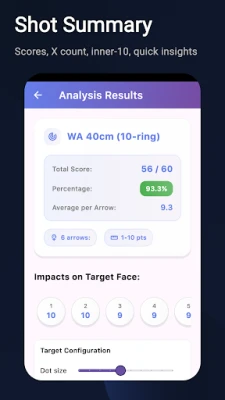 • Choose arrows per end (e.g., 3 or 6), enter X / 10 / 9 (with inner-10), and see running totals and set/series scores in real time.