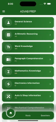 Master the ASVAB with the most comprehensive preparation app available. Designed by military experts, this app helps you boost your scores on all ASVAB subtests including General Science, Arithmetic Reasoning, Word Knowledge, Paragraph Comprehension, Mathematics Knowledge, Electronics Information, Auto & Shop Information, Mechanical Comprehension, and Assembling Objects.