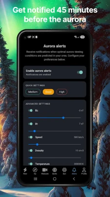 Get real-time Northern Lights alerts, accurate aurora forecasts, KP index & solar wind data—plus live webcams and cloud maps to pick the best spot tonight.