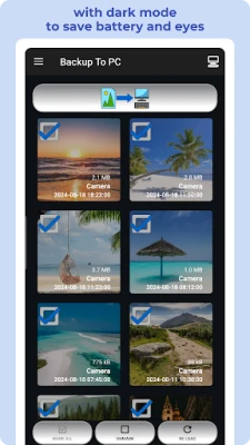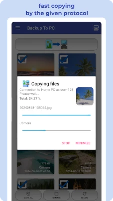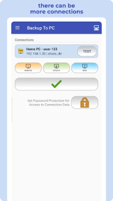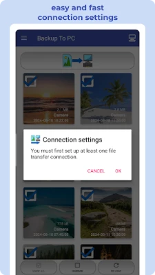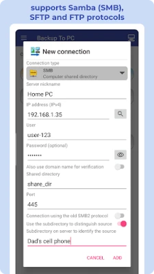 π BACKUP TO PC simplifies the transfer and organization of your photos and videos from your mobile to your computer. Easily create backups with a single click, automatically organizing files into app-specific folders. The transfer is done using protocols π (Samba - shared directory) SMB, π SFTP, or π FTP.