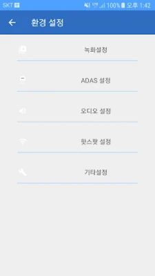 Environment setting: You can set the environment of black box. (recording setting, ADAS setting, audio setting Wi-Fi setting and Other setting)