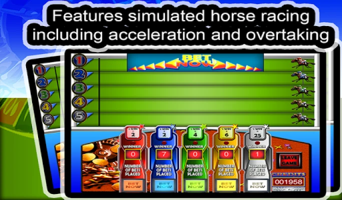 Place bets using "BET NOW" lights+buttons, only while "BET NOW" notice appears. Once button lights turn off and Bet Now sign disappears, betting is over & racing begins. If credits run out,exit game, activate virtual change machine in main menu for free credits. Win or lose when all horses reach the racing post. The fastest deby post time wins.