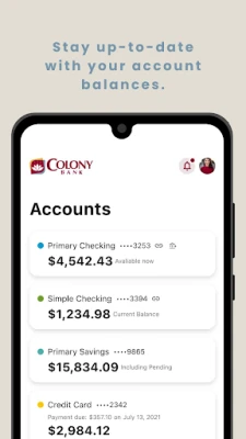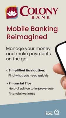 Using the Colony Bank Mobile App, you can manage your money anytime, anywhere—right from your mobile device! Colony Bank Mobile App is a fast and secure way for Colony Bank customers to check balances, view account activity, pay bills, and make transfers between accounts. Colony Bank Mobile App is available 24/7.