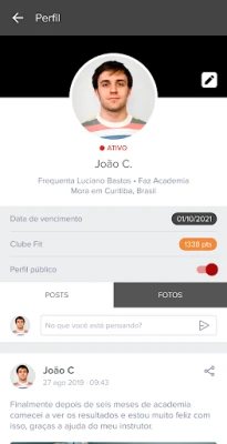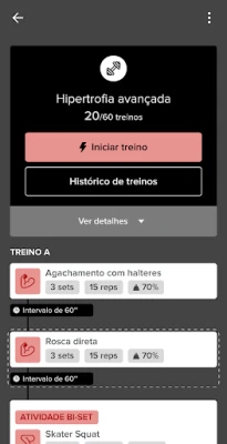 - Acesso a ficha de exercícios - Definir e acompanhar carga para os treinos - Visualizar avaliação física - Verificar a frequência de treinamento - Informações sobre contrato/vencimento - Realizar check-in nas aulas