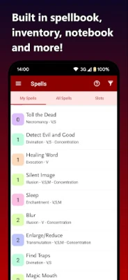 • Spell book with your known spells, and spell slots tracking
