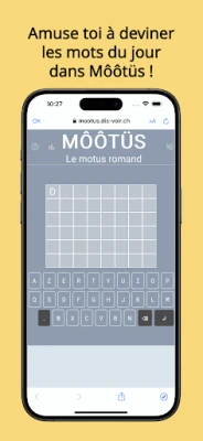 - Devine voir : Jouez à une variante du célèbre jeu MOTUS avec des mots suisses ! Devinez le mots caché du jour avec un nombre limité de tentatives. Testez vos connaissances du vocabulaire suisse romand et amusez-vous à découvrir de nouveaux termes.