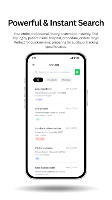 Powerful Search: Instantly find any log by patient name, hospital, procedure type, or date. Your entire work history is at your fingertips.