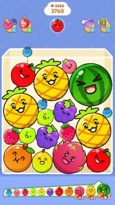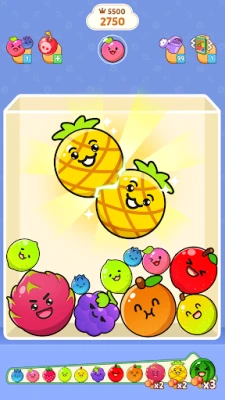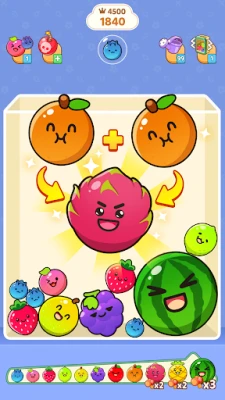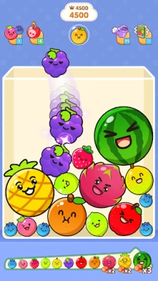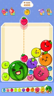 - Merge fruits: When two same fruits touch, they merge into a bigger one! Keep combining them to create larger and juicier fruits.