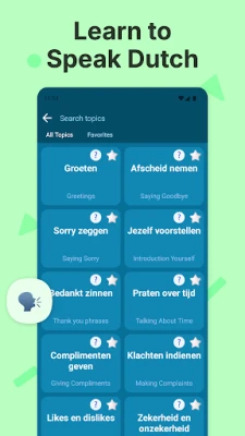 Our Dutch language app equips you with all the words and phrases you need to sound natural. We've carefully designed our Dutch lessons to cover topics that are useful for beginners. You can quickly expand your Dutch vocabulary and start having conversations in no time.