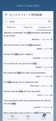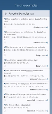 Favorite Examples: You can save your favorite examples to view, listen to again, or quickly access the word of each example.