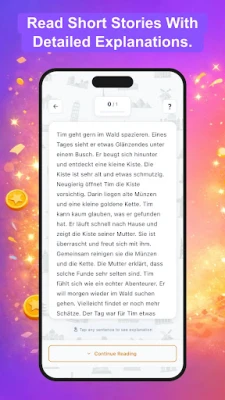 Tap any sentence to see its translation and grammar breakdown. Build vocabulary through context — no word lists, no drills. Just real German reading practice that sticks.