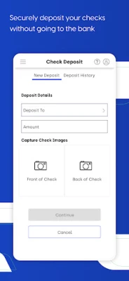 • Easily deposit checks in a snap, even while on the go
