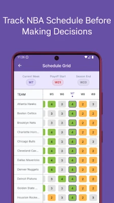 NBA Schedule Grid - Displays a visual grid showing games per week for every NBA team, aligned with fantasy league schedules and playoff weeks to help with strategic planning.