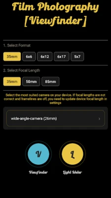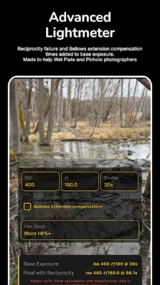 A Viewfinder app for film photograhers. With light meter that adds exposure compensation for Reciprocity Failure or bellows extension.