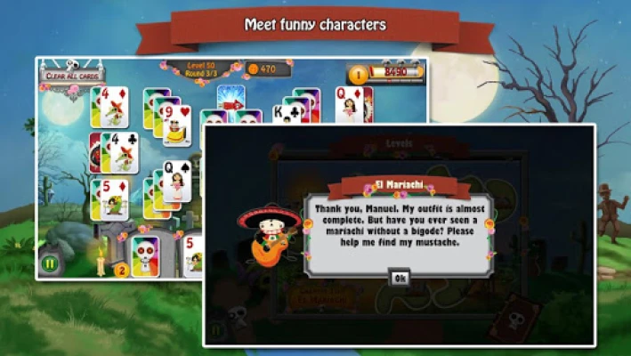 There is an old legend in Mexico that on "Dia de los Muertos" the Day of the Dead, the gates of heaven will open and the souls of our loved ones can visit the land of the living. That's where the story of Manuel and Maria begins. An evil soul has kidnapped Maria. And now Manuel asks for your help to join him in this incredible adventure through the land of the dead after his beloved bride. Journey through beautiful scenery, relaxing music and help funny characters to find their belongings. Prove your skills in this challenging solitaire game!