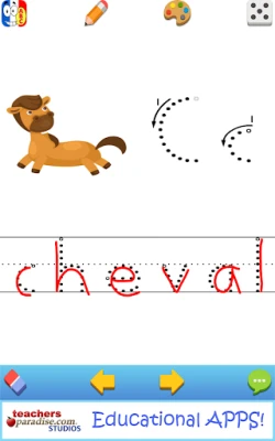 Learn how to read and write in French while practicing handwriting will expanding your child's French vocabulary and alphabet knowledge. Begin your little learners handwriting fun with flashcards to help your child learn that A is for abeille and B is for ballon. Seeing and hearing the letter and image representing each letter will help your child learn their new language. Continue with four practice options that allow you to choose the level of difficulty. Practice tracing and writing French uppercase and lowercase letters, tracing French vocabulary words then work up to writing the words all on their own. Colorful images representing each letter will help your child associate the object with the letters of the alphabet. This educational game provides pronunciation of all image names and letters in French. Intrigue the littlest learner teaching handwriting without paper while practicing the proper way to write each letter and word using Handwriting Without Tears® manuscript . No need for messy pens or unsharpened pencils this educational game provides endless handwriting fun.