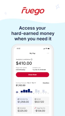 Set savings goals and see earning potential by viewing earned and scheduled pay and by keeping tabs on spending patterns. Pay bills on time, avoid any late fees on expenses, and take control of your finances. Fuego can help you manage your money while making payday loans a thing of the past.