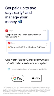 With Fuego’s mobile banking1 solution, you can transfer funds to any account number, search for nearby surcharge-free ATMs, search for cash load locations with Visa ReadyLink2, temporarily freeze your Fuego Card in the case of theft or fraud and activate your card and set your PIN – all within the app3. Plus, by adding your card to your phone’s digital wallet, you can make purchases via Apple Pay® or Google Pay™. Fuego helps to make online banking easy, with no credit check4 required when you enroll. There are no inactivity fees, no cost to set up, no fees associated with wage draws, and you can access your pay up to two days early5. Plus, the Fuego Card is protected by Visa’s Zero Liability Policy.