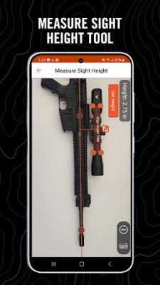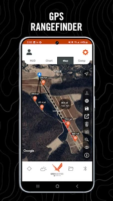 Map Mode allows users to range targets by dropping pins on satellite imagery of a shooting location. Range and solution are displayed by tapping on the target pins. Map Mode also introduces external ballistic data overlays on satellite imagery. These overlays display a bullet's performance along its path according to parameters specified for each rifle profile.