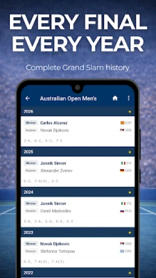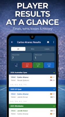 ✅ Dive into player histories for stars like Carlos Alcaraz, Jannik Sinner, Novak Djokovic, Rafael Nadal, Roger Federer, Serena Williams, Iga Swiątek, Aryna Sabalenka, Coco Gauff, and more