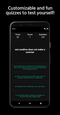 The app contains a collection of relevant, useful and popular English idioms, phrases, proverbs and phrasal verbs and other common expressions. Includes definitions, meanings, examples, usage and pronunciation in a dictionary like yet fun format.