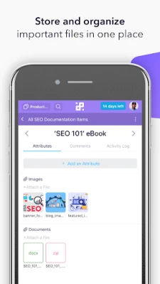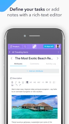 Infinity was built to help you organize any type of data. The mobile app makes sure to offer the same flexibility. Just like in our web version, you can build and shape your items with 15 custom attributes that will allow you to create to-do lists, CRM, databases, or anything else you need.