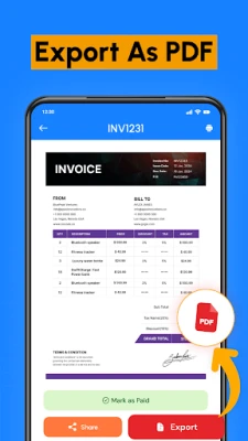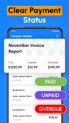 The invoice generator app supports different currencies and number formatting. You can keep records of your payments by marking the invoices paid, unpaid, partially paid, and overdue in this invoice and billing app.