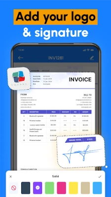 In the receipt app, you can select the invoice template you want to use and add your business information, signature, client details, items, prices, taxes, shipping fees, etc.