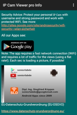 If you click on the webcam image (short click), the cam list is called up. If you select a cam, the entry will be marked. You can click IP Cam Settings in the IP Cam menu. In the cam list you can select the desired IP cam. With a short click on an entry you will see the corresponding IP Cam. If you reopen the app, you will see the selected IP cam (indicator moving flag). A long click on a cam in the list opens the edit dialog for editing the IP Cam Name, IP Cam URL (Link), IP Cam User Name (optional) and the IP Cam Password (optional).