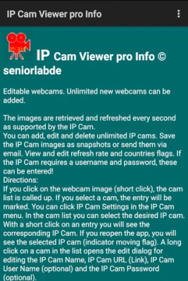 You can add, edit and delete unlimited IP cams. Save the IP Cam images as snapshots or send them via email. View and edit refresh rate and countries flags. If the IP Cam requires a username and password, these can be entered!