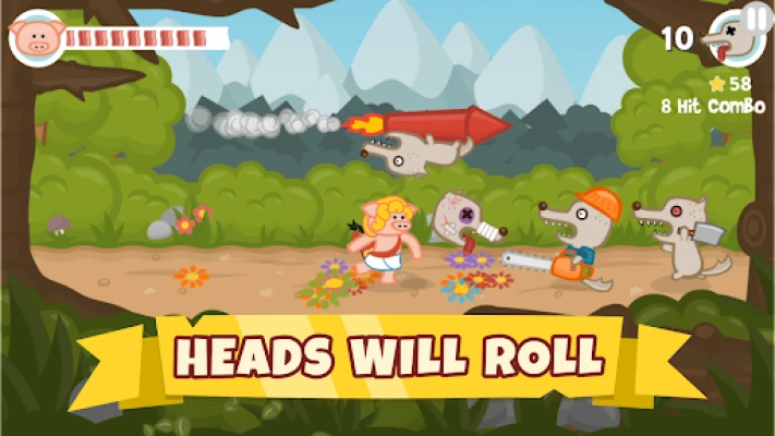 Swipe fast to make our bacon pig fight hero jump over or dodge under the rocket wolves or swinging wrecking balls! Use one finger punch attacks to knock your enemies back. Like in other fun beat em up fight games, this little bacon ninja fighter can kung fu punch and kick enemy projectiles back. Beat a sword fighting wolf and it will drop its weapon, which your tiny piggy hero then can catch and use in the battle.