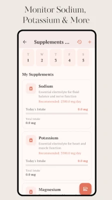 * Supplements Tracker: Log vitamins, electrolytes, and daily supplements.