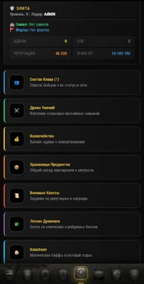 Одиночкам здесь тяжело. Создайте свой Клан, качайте его уровень и изучайте клановые умения. Участвуйте в осадах командирских фортов на Полях Боя (Battlefield). Захваченная территория будет приносить вашей казне налоги и репутацию!