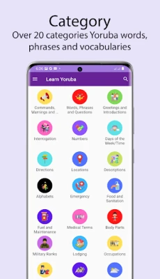 Learn Yoruba Language app contains commonly-used words, phrases and vocabularies with native pronunciation for beginners and travelers in 23 categories including: