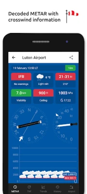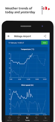 - Graphs with weather trends today and yesterday: temperature, visibility, wind speed, QNH