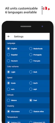 - All units are customizable units: speed (knots, km/h, m/s, mph), altitude (meters/feet), visibility (kilometers/miles), temperature (Celcius/Fahrenheit) and air pressure (Hectopascal, Inch Hg)