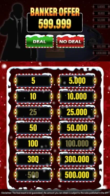 Based on the classic deal-making game shows, you’ll start with 16 sealed cases. Pick one to keep - hoping it holds the 1,000,000 prize. Then, open the remaining cases round by round. After each round, the banker will make you an offer to buy your case.