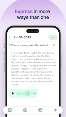 Audio & Image Journaling: Capture life's moments vividly by adding voice notes, photos, or drawings to your journal entries, making your reflections richer and more personal.