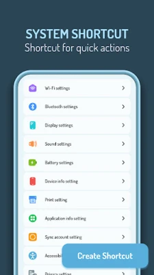 🔹System Settings: Quick access your phone's actions with ease. Create shortcuts for functions like Wi-Fi, Bluetooth, Display, Sound, Battery, Device Info, Printing, Application Info, Sync Account, Accessibility Settings, Privacy Settings, and more. ⚙️🔧