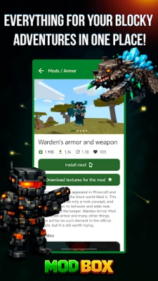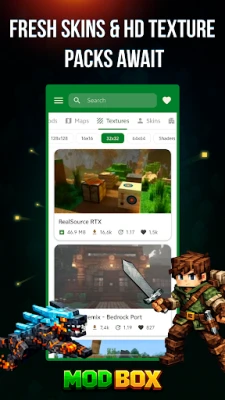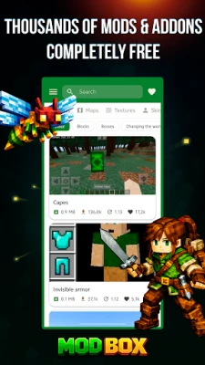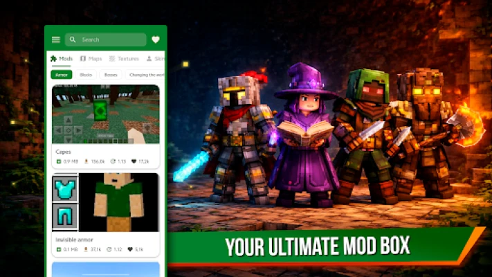 ModBox for Minecraft PE is a free helper for Minecraft Pocket Edition (MCPE) and Minecraft Bedrock Edition (BE). Discover fresh maps, seeds, mods / addons (Behavior Packs), skins (skin packs), buildings / schematics, texture packs (resource packs) and shader packs. Choose what you like and import / install it into Minecraft with our built-in installer / launcher — no extra steps.