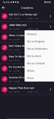 Using mp3 song cutter app you can make fast and easy Ringtones for your own. you just have to select your song or record the sound then select the wave part that you wan to make as ringtone or else apply the time duration that you want to edit and audio trimmer will create a new ringtone for you. you can save this ringtone as per your name in mp3 editor folder. after creating ringtone you can set it as your default ringtone, alarm tone, notification sound or sms tone. In mp3 converter You can convert any form of audio file in mp3 format.